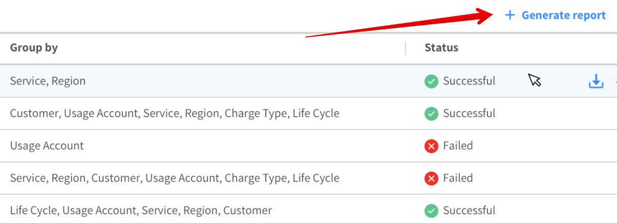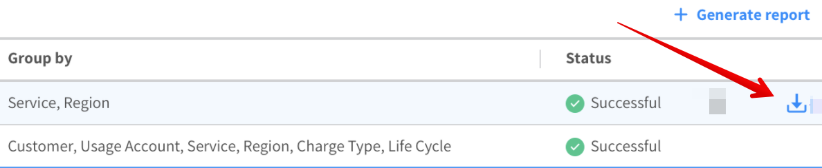 A report that was successfully created is downloadable via the UI for a limited period of time. On the right side of the Reports table, click the Download icon.