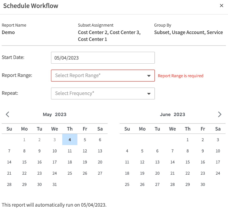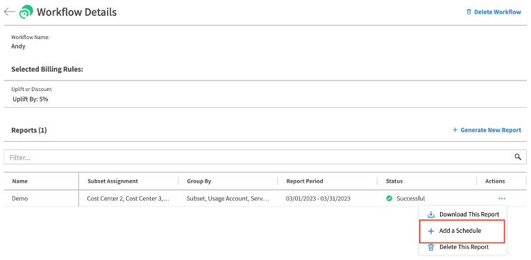 1. Click the report you want and select Add a Schedule. The Schedule Workflow window opens.