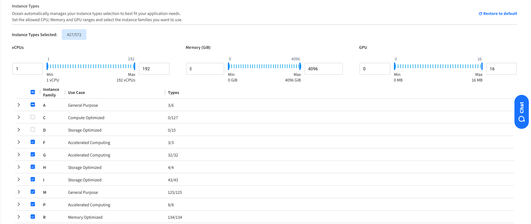 In the Machine Types definition of the Compute tab, all the machine types are already selected by default. Just leave this default setting on so that Ocean can choose from all possibilities. Ocean will then carefully match the node type to the specifications of the scheduled user workloads.