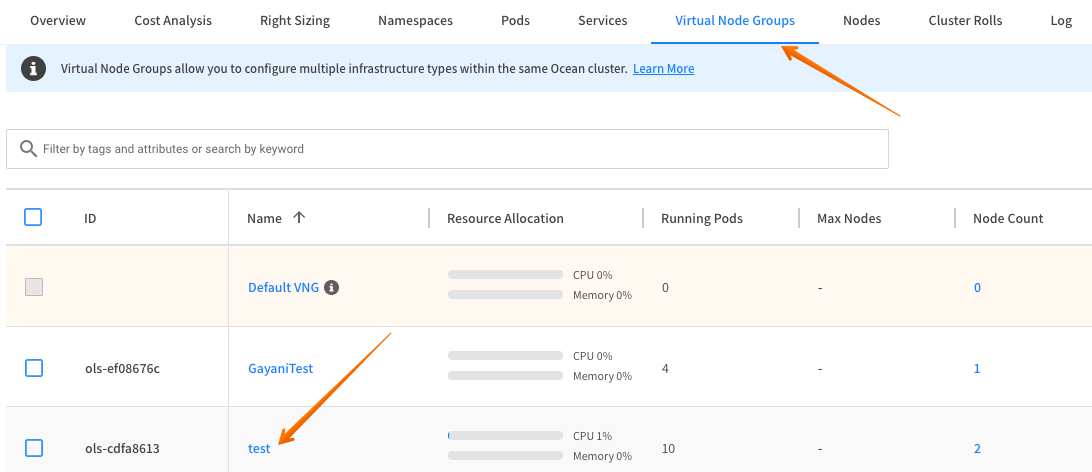 Click the Virtual Node Groups tab. The Virtual Node Groups tab opens and displays a summary of all the VNGs defined in the Ocean cluster.