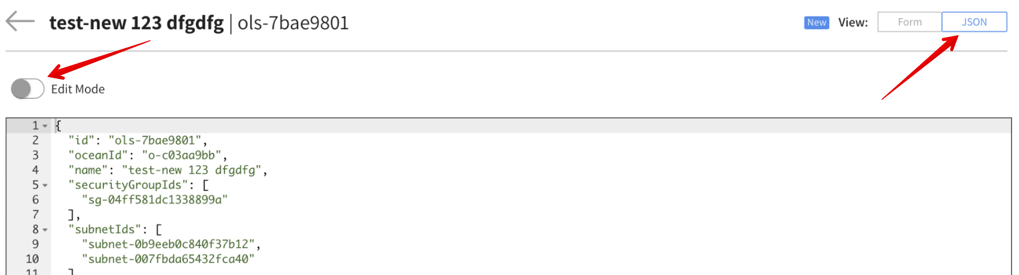 In the console, you can also review and edit the configuration directly in JSON format. This provides more flexibility and enables you to utilize VNG features that are supported in the API without leaving the Ocean console. (These are usually new features that have been implemented in the API, but are not yet accessible in the UI.)